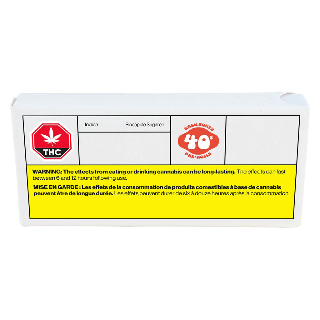 Back Forty’s Pineapple Sugaree is a potent indica lineage, derived from a cross of Zktlz x Mendo Pineapple x Sugaree, resulting in a sweet aroma. With high THC potencies, the top terpenes are limonene, nerolidol and caryophyllene. Back Forty pre-rolls are machine-rolled and slim with a consistent, even burn, and have been packed with a resealable film to ensure freshness after multiple sessions. 40s were made for sharing. Back Forty 40s packaging is 100% recyclable. The carton is made purely from post-consumer waste. Just toss in the blue bin.